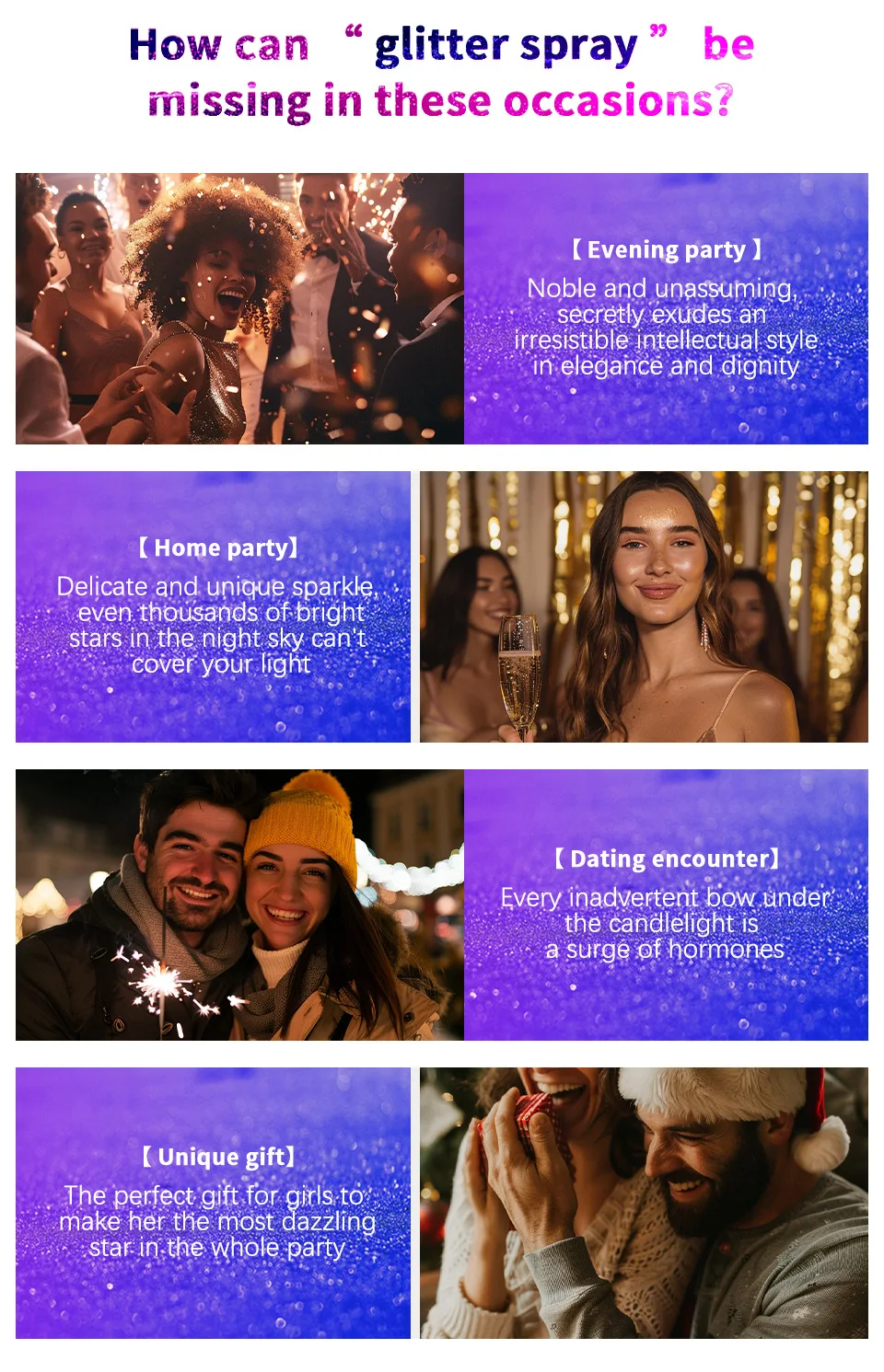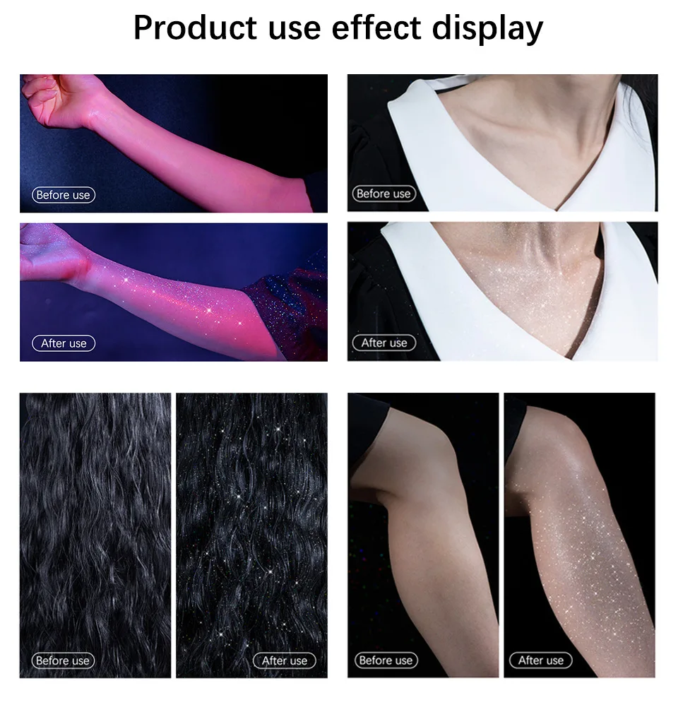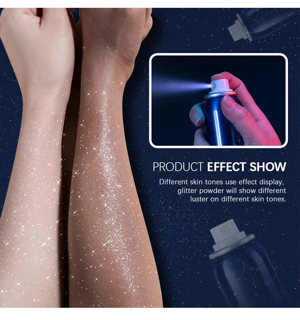 1.HOLOGRAPHIC POWDER COLORFUL LUSTER:High pressure nozzle,fine mist feeling.Even coverage,natural fit